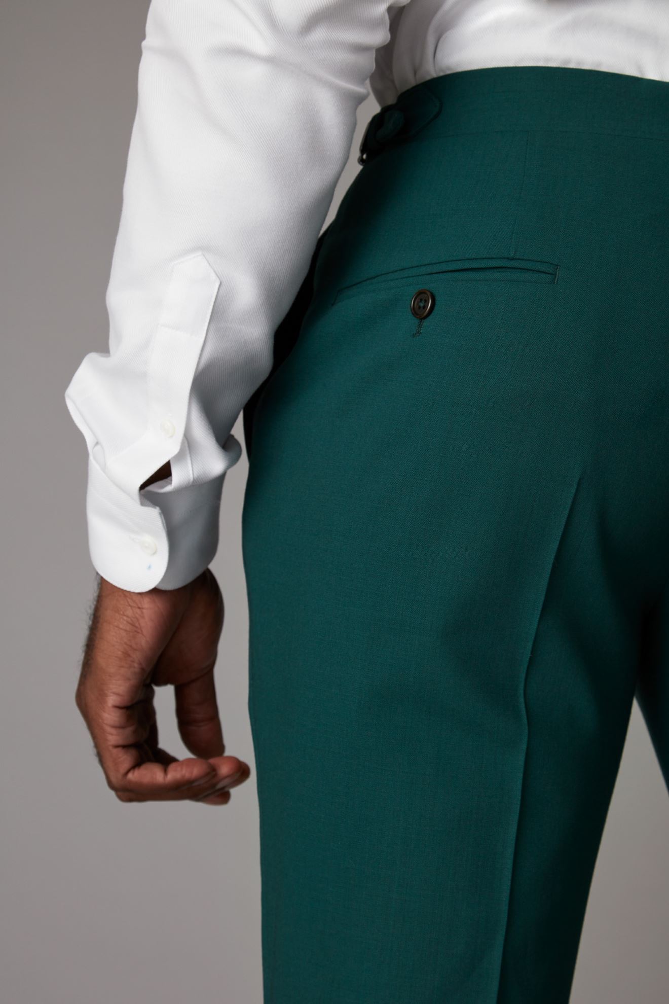 Green trousers finished with silver buckle side adjusters for that great fit.